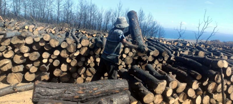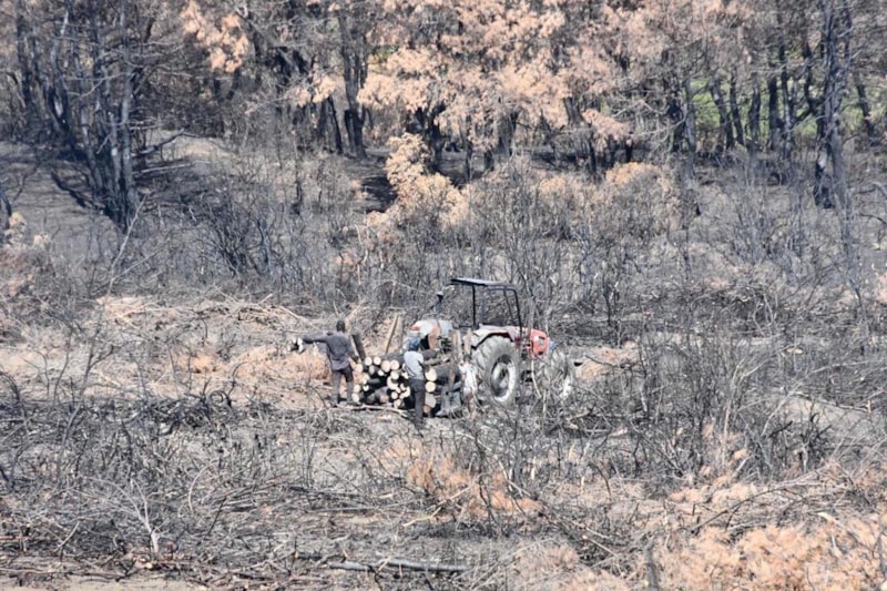 Yangında zarar gören ağaçlar, testerelerle belirli ölçülerde kesilip, traktörlerle taşındıkları yol kenarında istifleniyor.