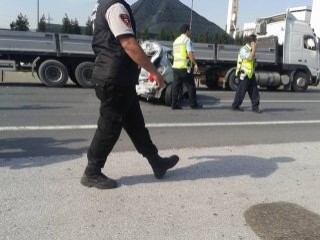 Aynı istikamette seyreden TIR ve yolcu otobüsünün arasında kalan araçtaki 5 kişi yaralanırken 1 kişi hayatını kaybetti.
