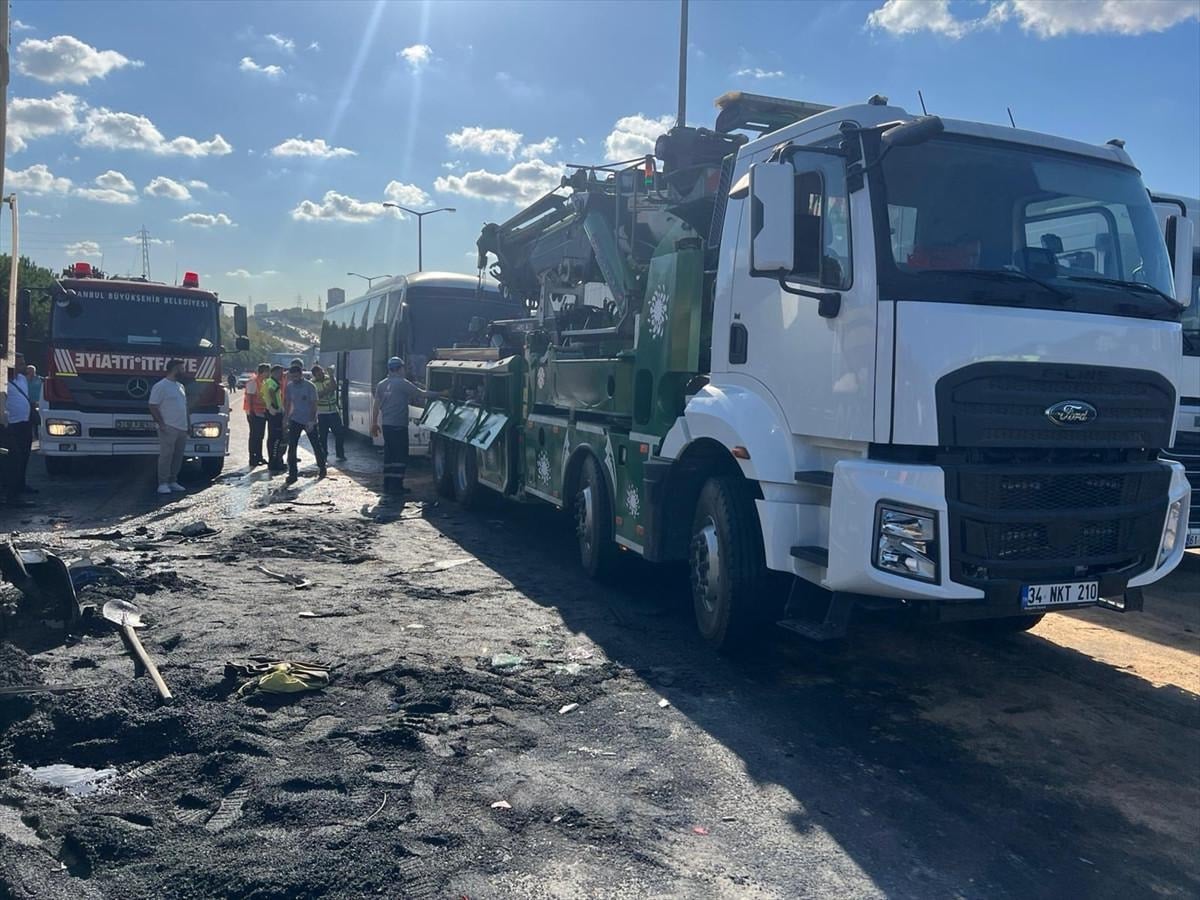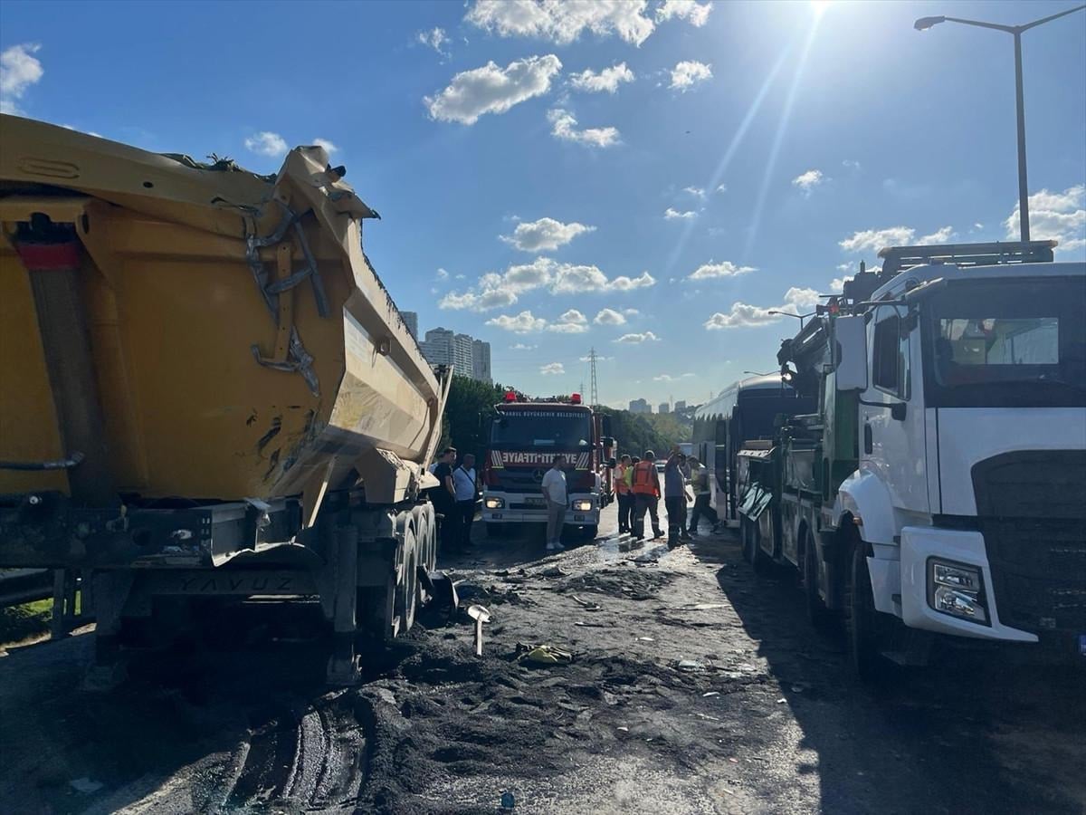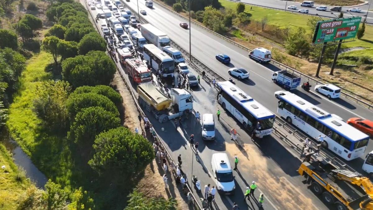TEM Otoyolu Edirne istikametinde, aralarında hafriyat kamyonu ve 2 otobüsün de karıştığı bir kaza meydana geldi.