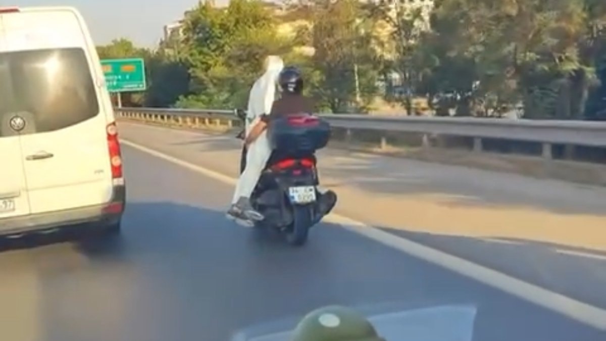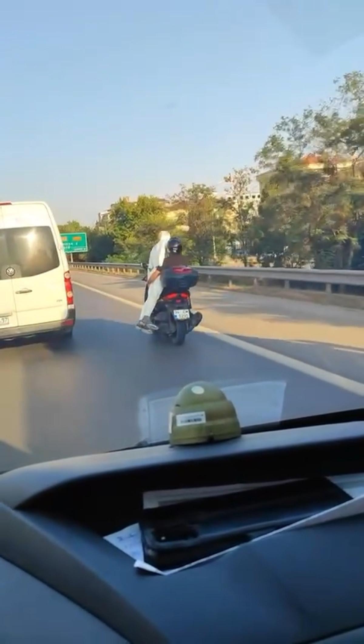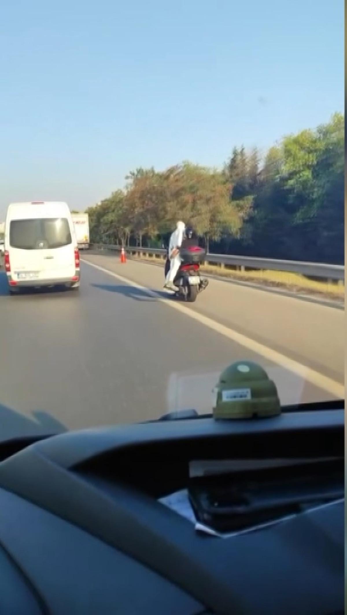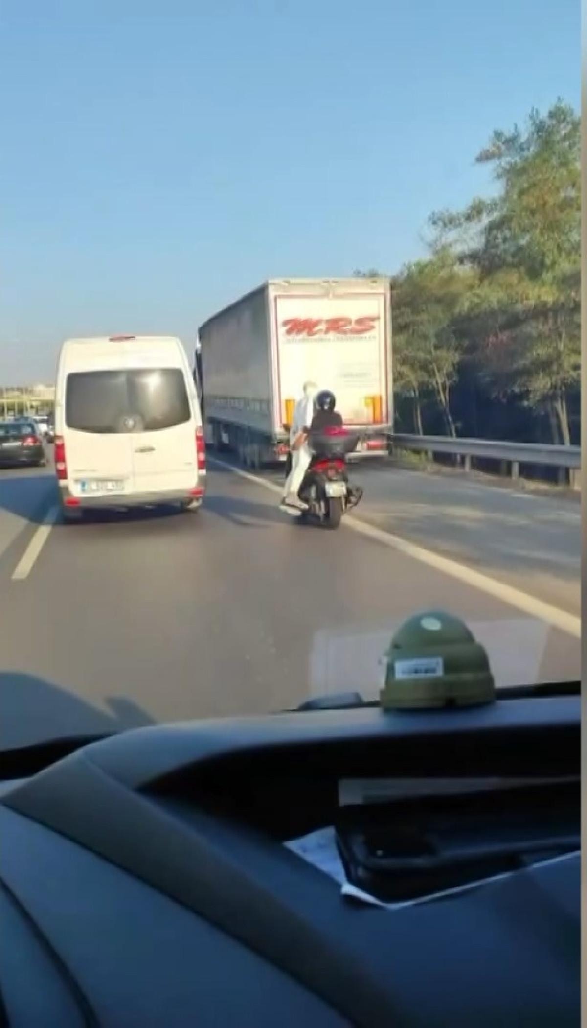 Sultanbeyli ilçesi TEM otoyolu Ankara istikametinde ilerleyen bir motosiklet sürücüsü, bir eliyle motosikletin direksiyonunu tutarken, diğer eliyle ise cansız mankeni taşıdı.