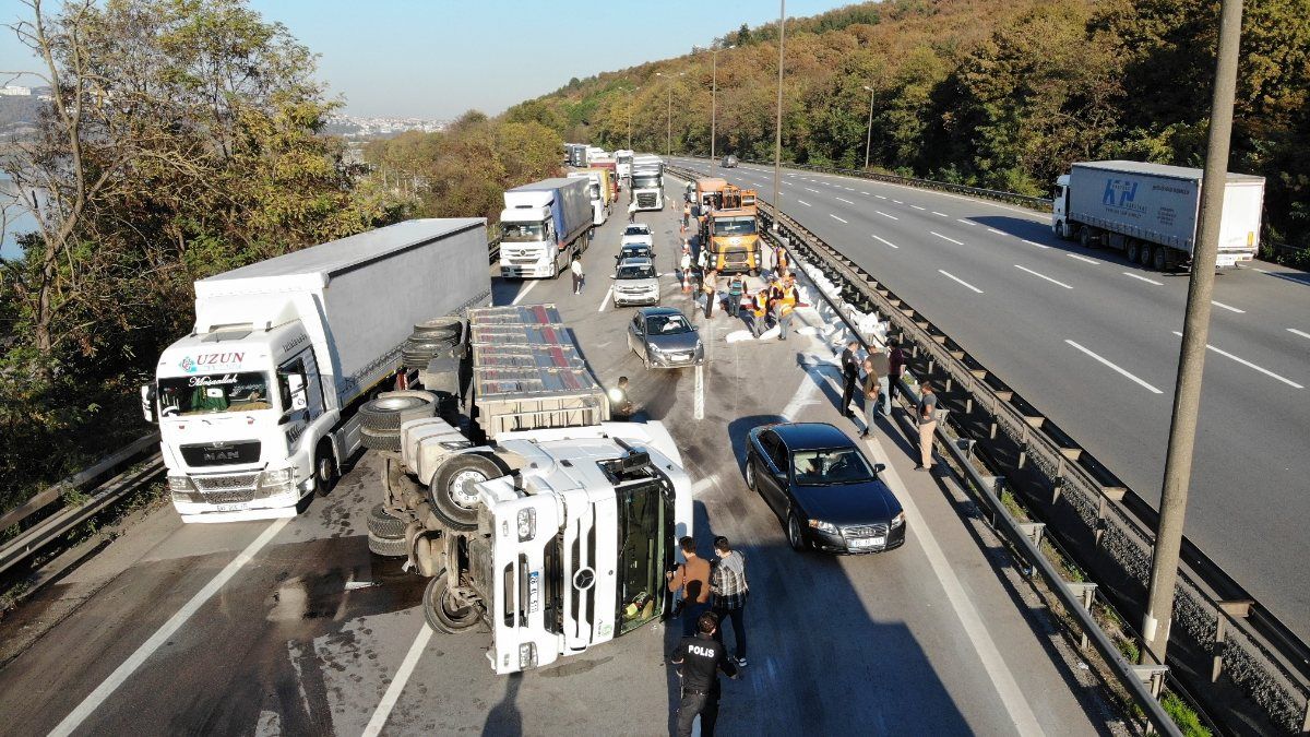 TEM Otoyolu’nda, Sakarya’dan İstanbul’a seyir halinde olan A.R.T. idaresindeki şeker yüklü tır, Sapanca mevkisinde kontrolden çıkarak yan yattı.