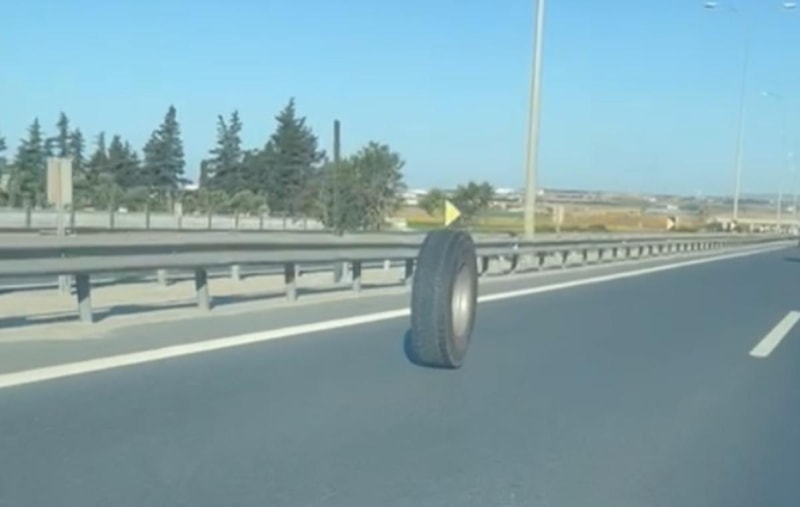Yerinden çıkan lastik, otoyol üzerinde kontrolsüz şekilde savrularak ilerlemeye başladı.