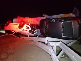 Bariyerleri sökerek takılan tır, orta refüjdeki diğer bariyere çarparak yan yattı. Tırın karşı şeride geçmesini bariyerler engellerken, tır kasasında bulunan sıfır kilometre 5 otomobilde ise büyük hasar oluştu.