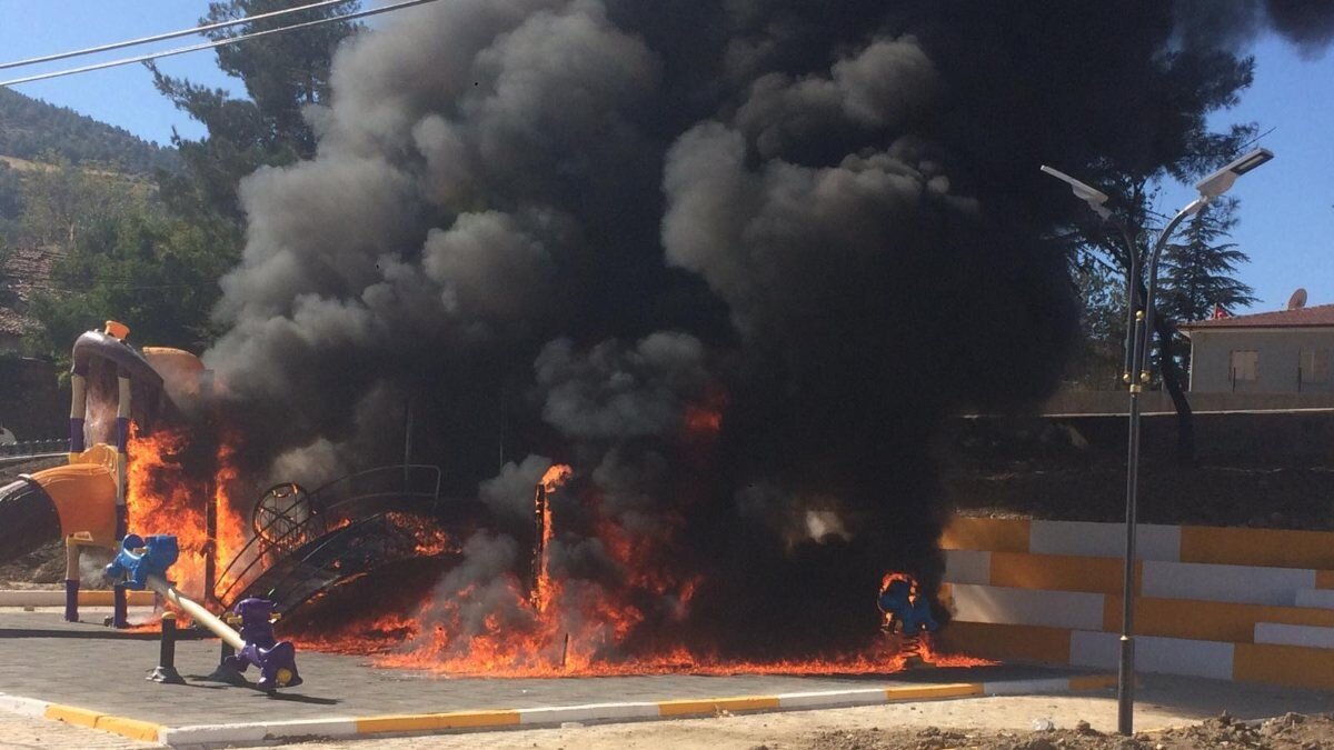Çocuk parkındaki aletler ve oyuncakların alev aldığını gören mahalleli, itfaiye ekiplerine haber verdi. Plastik aletler ve oyuncaklar nedeniyle alevler kısa sürede büyüdü.
