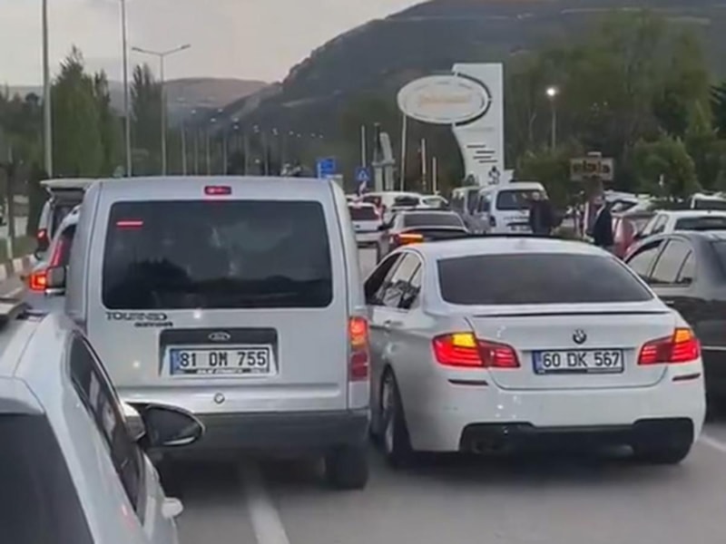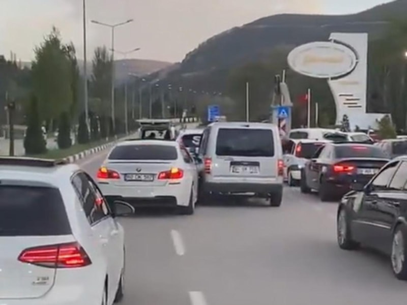 Tokat'ta düğün konvoyunda araçlarıyla birbirini geçmeye çalışan iki sürücünün trafikteki inatlaşması kameraya yansıdı.