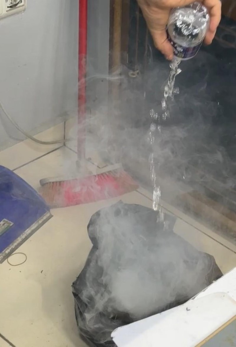 Ancak çabaları yetersiz kalınca eriyen bataryaların bulunduğu poşet, hızlıca dışarıya çıkarıldı.
