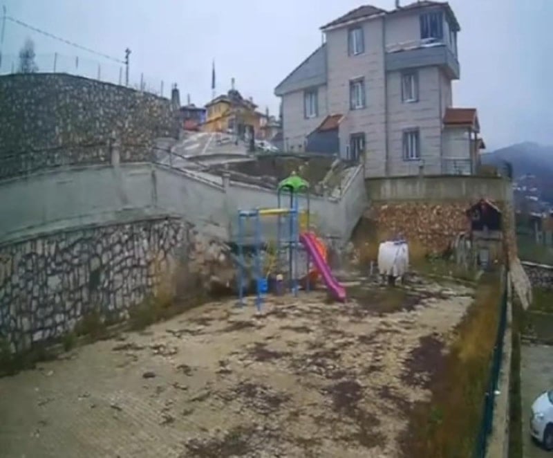 Sitenin oyun parkına düşen duvar, güvenlik kameraları tarafından kaydedildi.