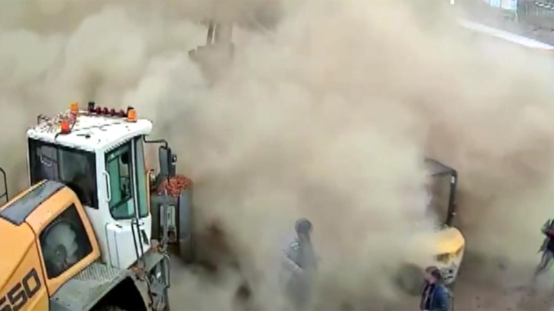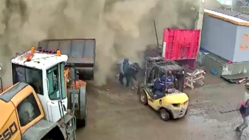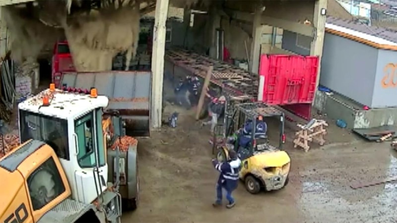 İş yerinin kamerasına yansıyan kayıtlarda garajda çalışmalarını sürdüren işçilerin çatının çökmesiyle hızla kaçışmaları, ortalığı yoğun bir tozun kaplaması görülüyor.