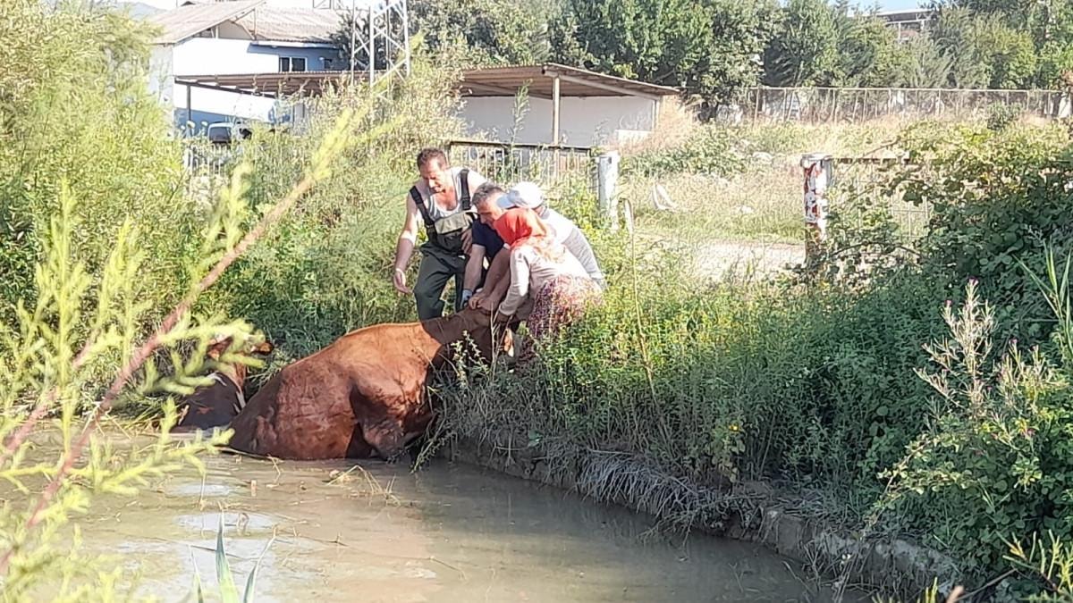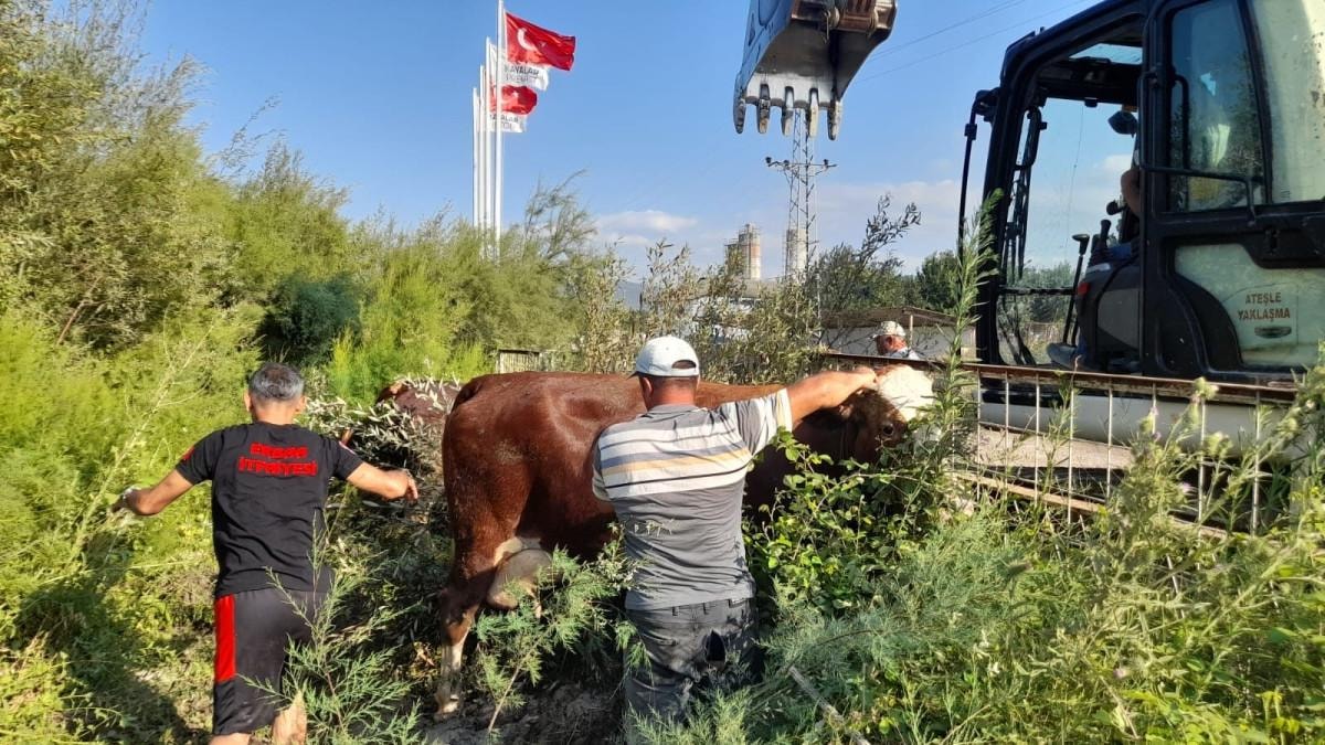 İtfaiye ekipleri, yakınlardaki bir işletmeye ait iş makinesinin desteğiyle gölette mahsur kalan inekleri yaklaşık bir saatlik çalışmanın ardından sağ salim çıkararak sahibine teslim etti.