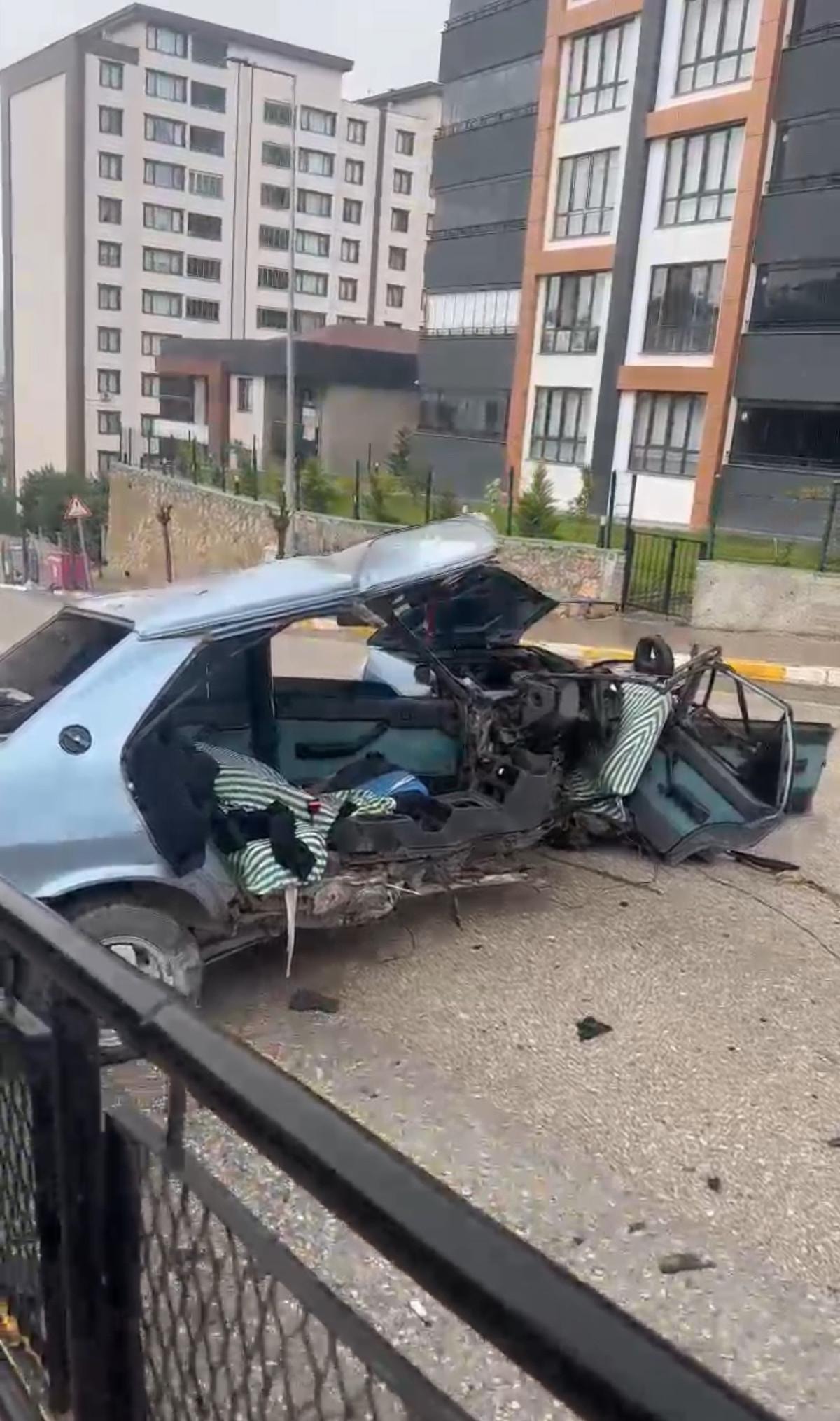 Kazada otomobilin çarptığı demir zarar görmezken Tofaş'ın ikiye ayrılması şaşırttı.