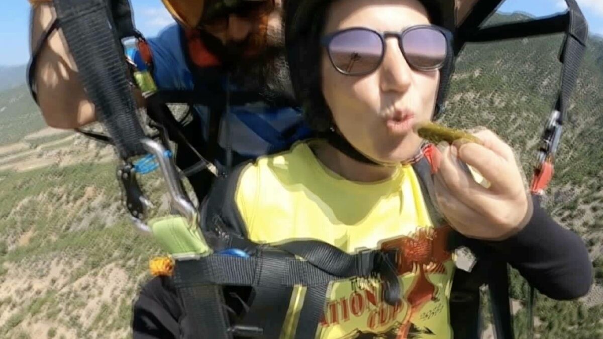 Tokat’ta düzenlenen yamaç paraşütü etkinliğinde iki yarışmacı, yaprak sarması yiyerek uçtu. Ortaya renkli anlar çıktı.