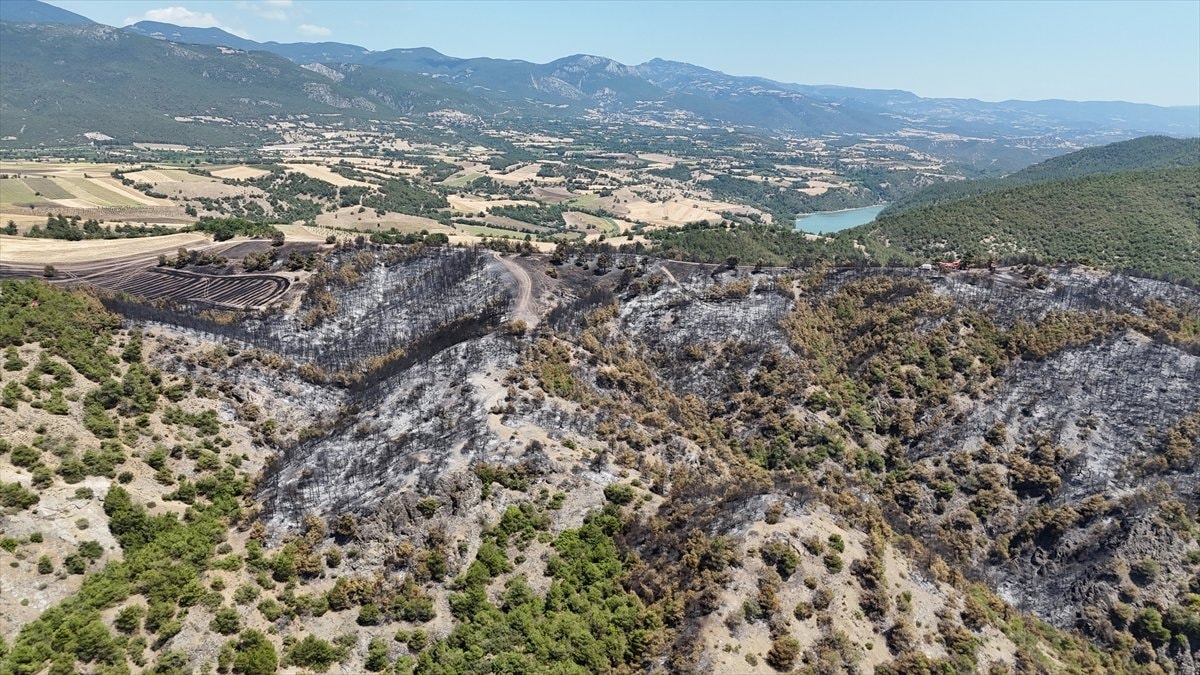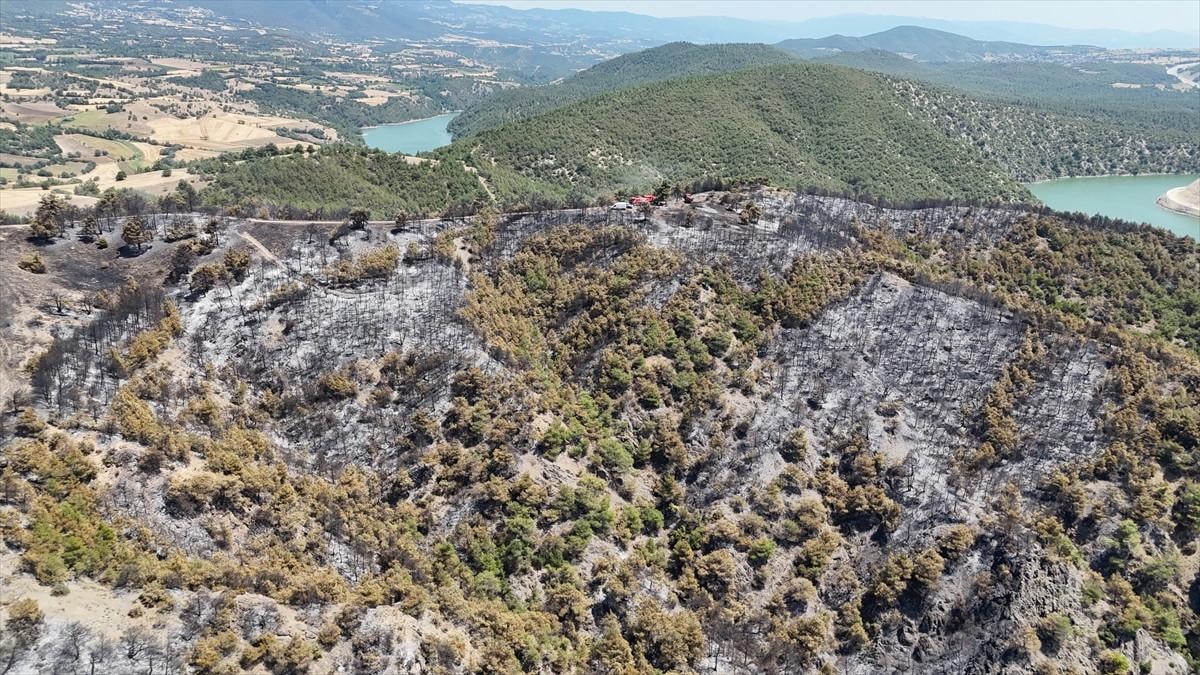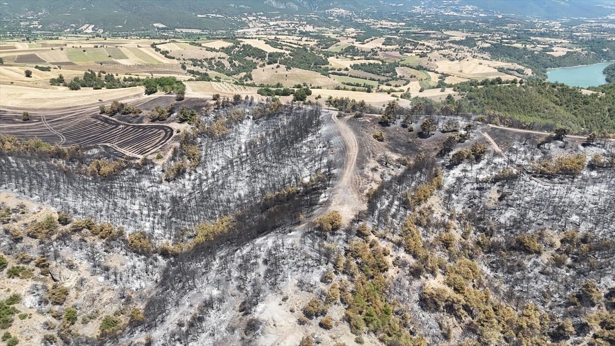 Gece boyu süren soğutma çalışmaları sonucunda söndürülen yangında zarar gören yaklaşık 50 hektarlık alan dronla görüntülendi.