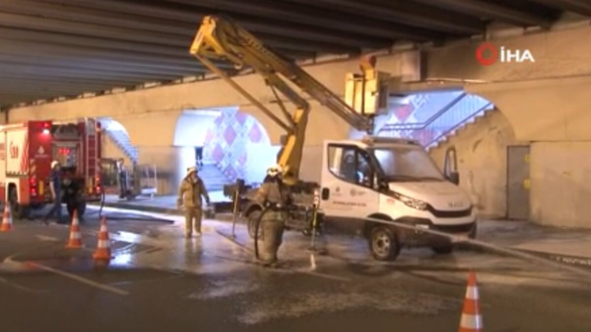 Çalışmalar sırasında alt geçitte bulunan kamyonet üzerindeki jeneratörden dumanlar yükselmeye başladı.