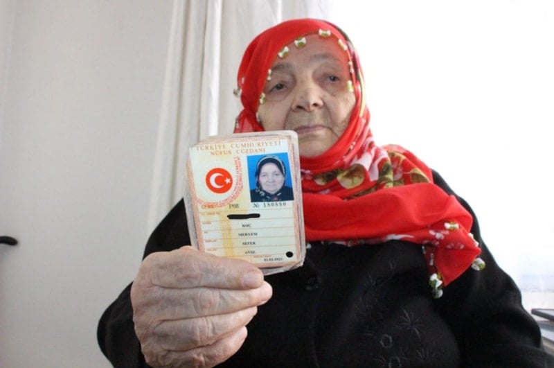 Hayrat ilçesinde yaşayan 102 yaşındaki Meryem nine, ileri yaşı nedeniyle kimlik yenilemeye gidemeyince, Nüfus Müdürlüğü ekipleri evinde kimlik yenileme işlemi yaptı. Cumhuriyetle aynı yaşı paylaşan Meryem nine, "Allah razı olsun, devletimiz sağ olsun, Allah başımızdan eksik etmesin" dedi.