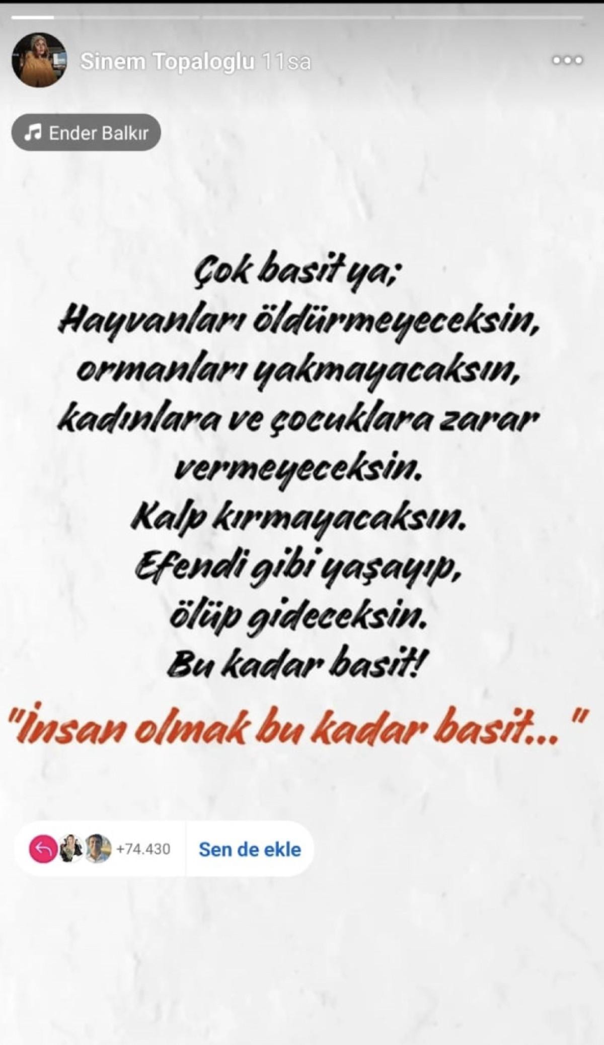 Sinem Somun’un ise sosyal medya hesabından, "Çok basit ya. Hayvanları öldürmeyeceksin, ormanları yakmayacaksın, kadınlara ve çocuklara zarar vermeyeceksin. Kalp kırmayacaksın. Efendi gibi yaşayıp, ölüp gideceksin. Bu kadar basit. İnsan olmak bu kadar basit" diye paylaşım yaptığı görüldü.