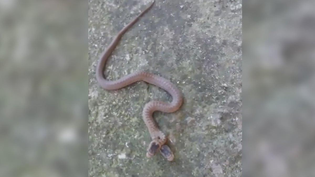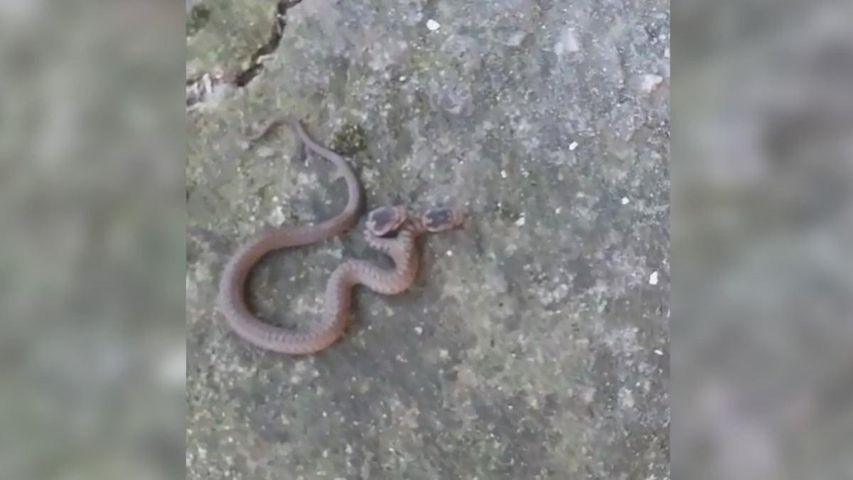 Şaşkına dönen çiftçi, doğada oldukça nadir rastlanan 50 santimetre uzunluğundaki 'Colubridae' familyasından çift başlı yılanı, cep telefonu kamerasıyla görüntüledi.