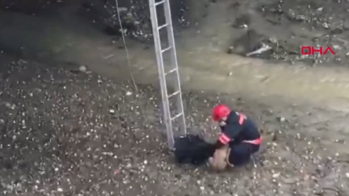 İtfaiye erleri, seyyar merdiven kullanarak dereye indi.