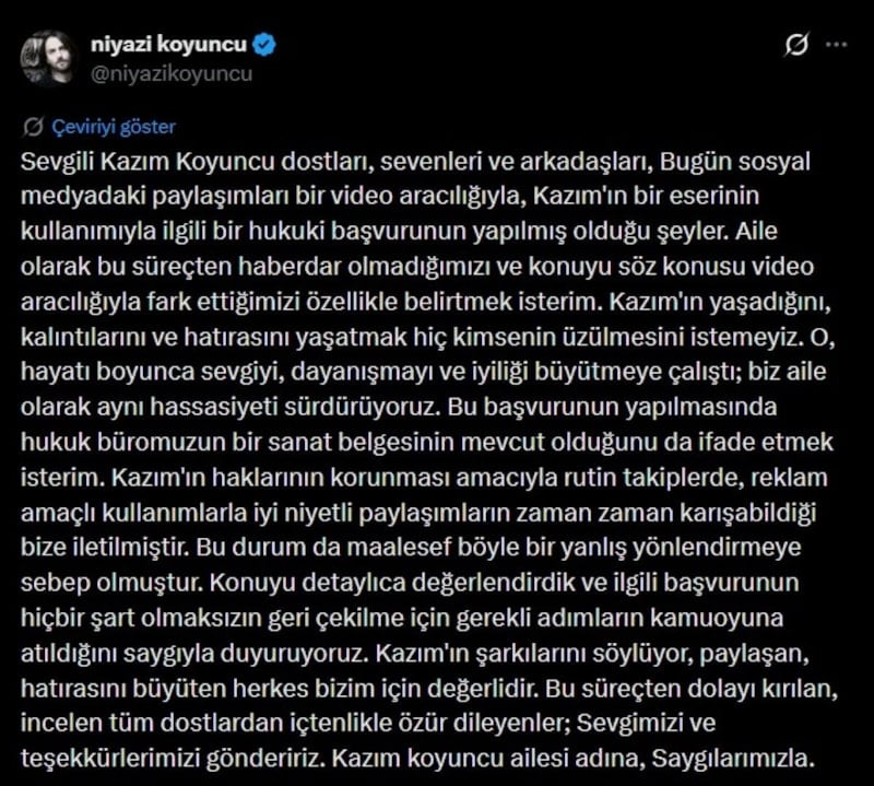 Kazım’ın müziğini ve hatırasını yaşatan hiç kimsenin üzülmesini istemeyiz. Hukuki başvurumuz, art niyet taşımamaktadır. Bu süreçte iyi niyetli paylaşımların yanlış anlaşılması söz konusu olmuştur. Başvuru geri çekilmiş olup, Kazım’ın şarkılarını paylaşan herkes bizim için değerlidir.