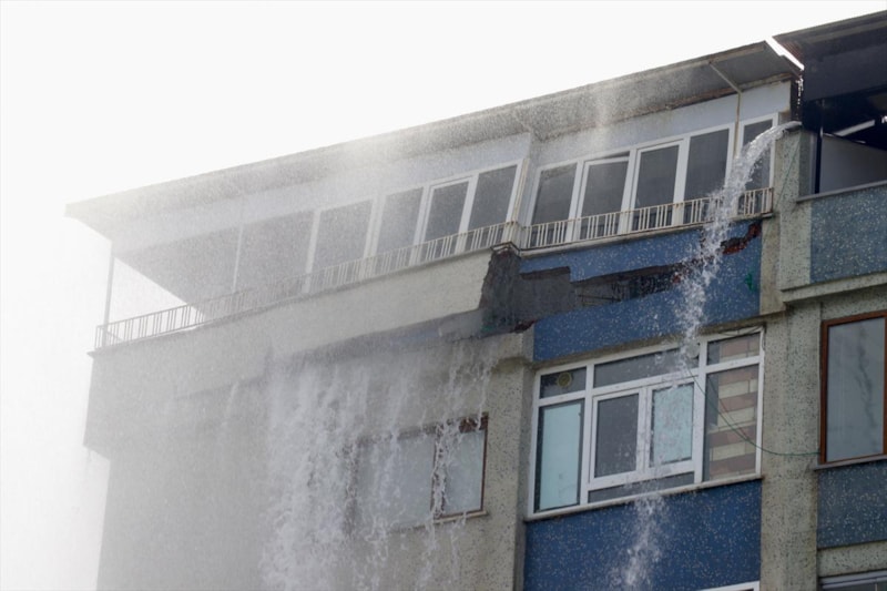 Yeni Mahalle'de ana isale hattı patlayınca tazyikli su, yolun karşısındaki 8 katlı apartmana kadar yükseldi. Apartmanın çatı katı hasar görürken ortaya ilginç görüntüler çıktı.