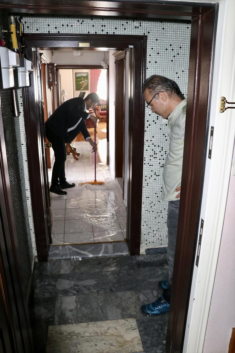 Apartman sakinleri de balkonlardaki suyu kovalarla boşaltırken dairelerden bazılarını da su bastı.
