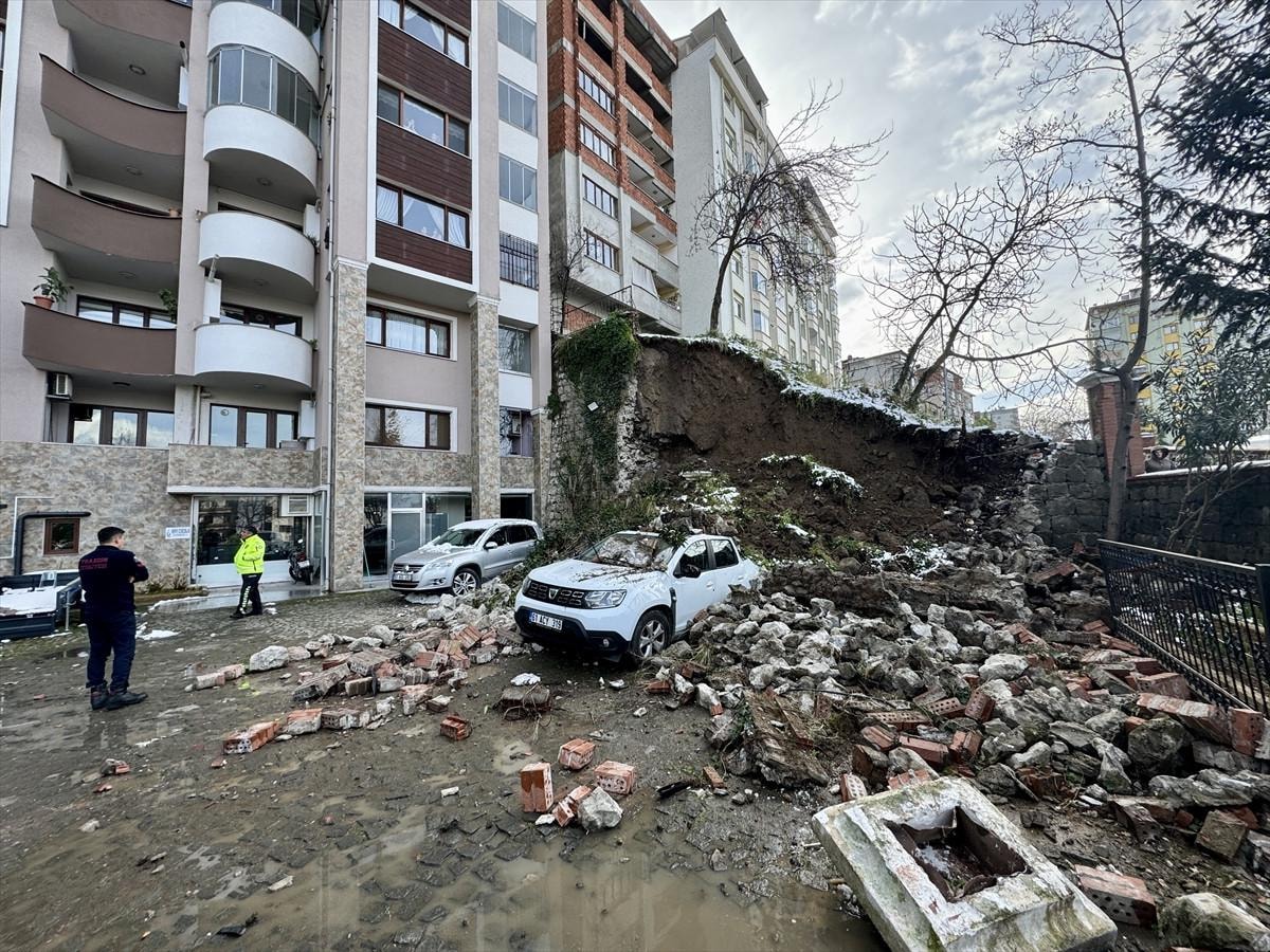 İstinat duvarı olaydan saniyeler önce buradan ayrılan Karslıoğlu'nun aracının yanına park edilen 2 aracın üzerine düştü.
