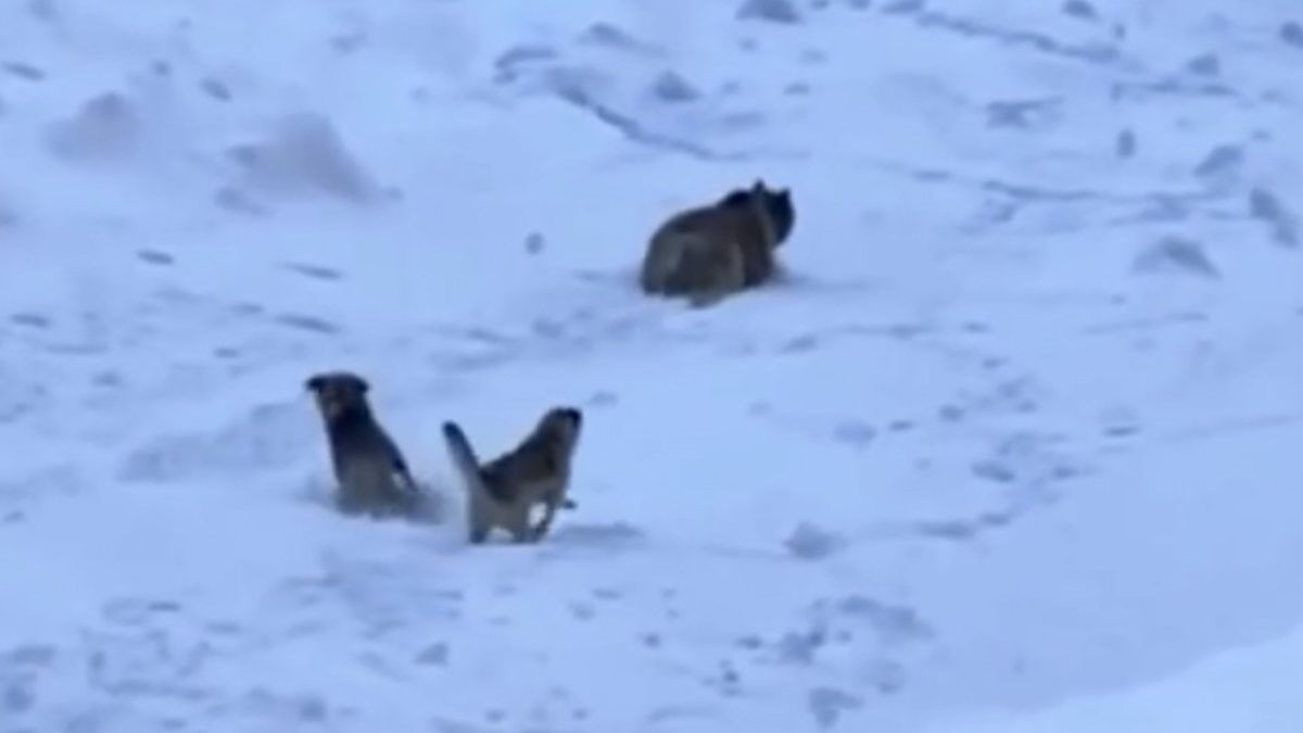 Bu esnada grubun yanında bulunan 2 Kangal köpeği, bozayıyı uzaklaştırdı.