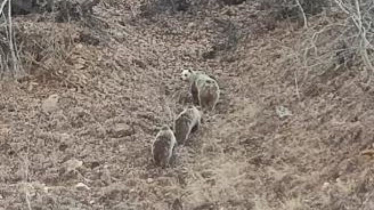 Uzun süredir yağış olmayan kentte normalde kış uykusuna yatması gereken anne ve 2 yavru boz ayı Pülümür Vadisi’nde yiyecek ararken görüntülendi.