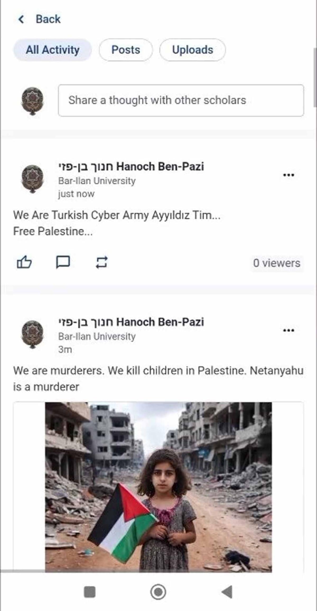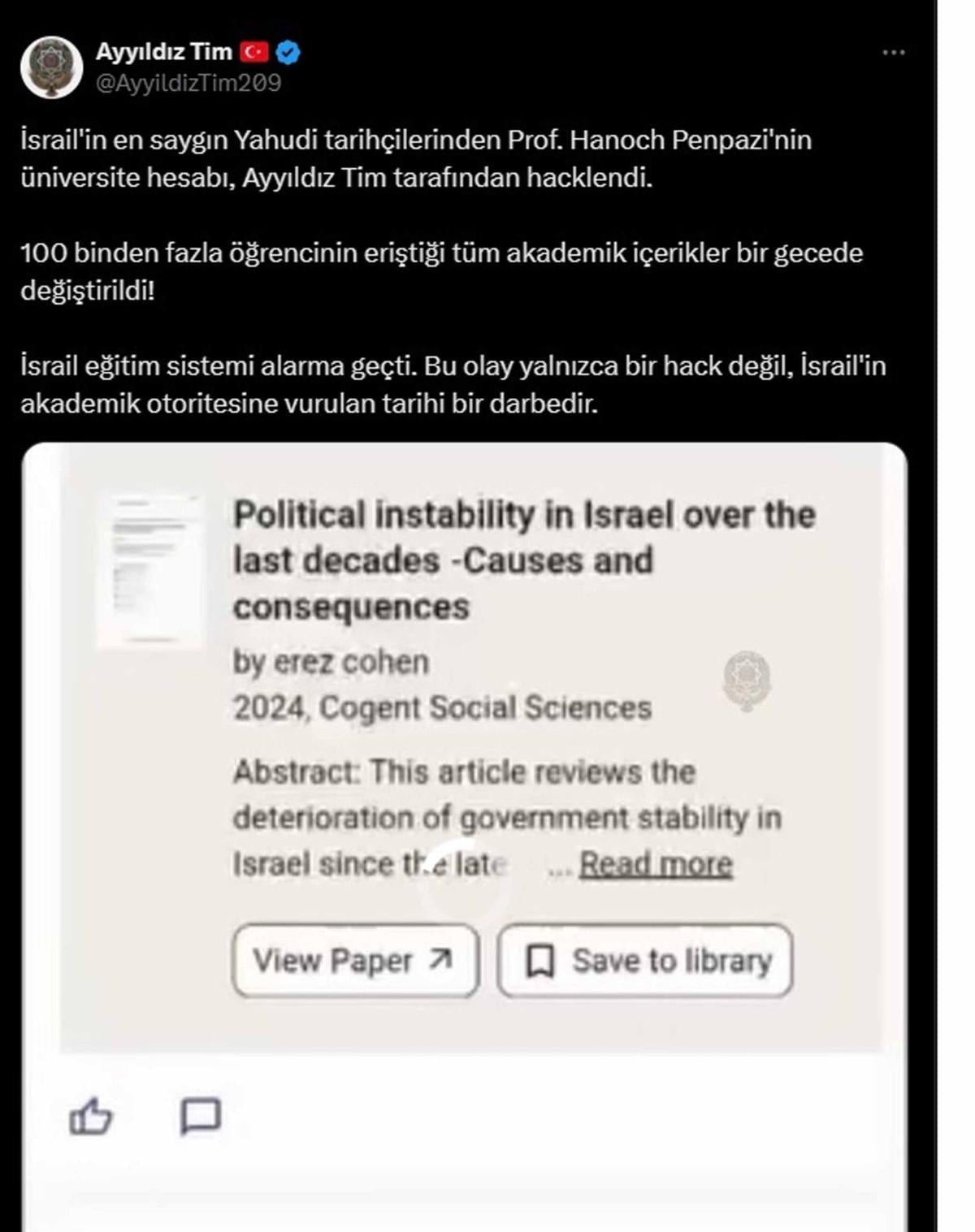 Grup, "İsrail'in en saygın Yahudi tarihçilerinden Prof. Hanoch Penpazi'nin üniversite hesabı, Ayyıldız Tim tarafından hacklendi. 100 binden fazla öğrencinin eriştiği tüm akademik içerikler bir gecede değiştirildi. İsrail eğitim sistemi alarma geçti. Bu olay yalnızca bir hack değil, İsrail'in akademik otoritesine vurulan tarihi bir darbedir." açıklamasına yer verdi.