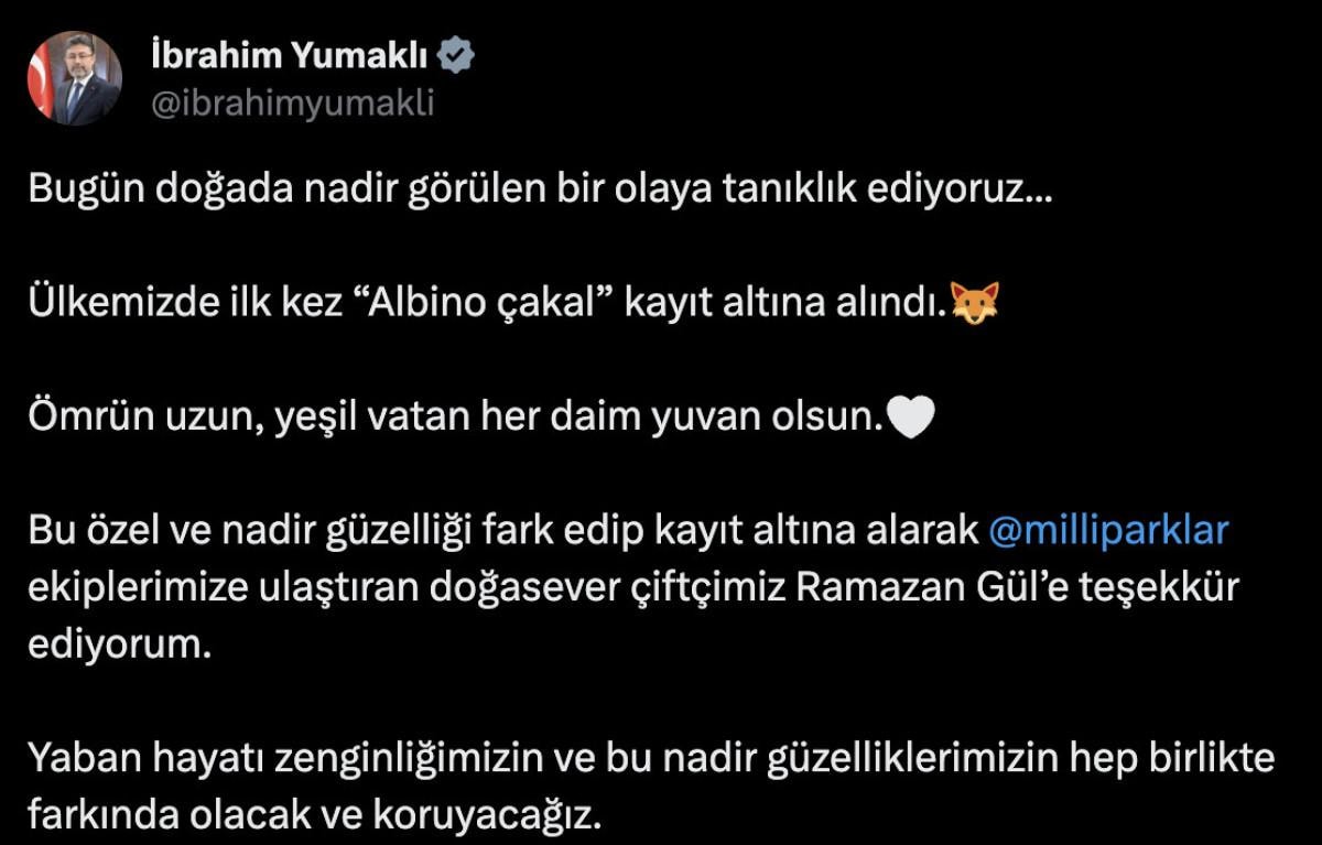 "Bugün doğada nadir görülen bir olaya tanıklık ediyoruz. Ülkemizde ilk kez 'Albino çakal' kayıt altına alındı. Ömrün uzun, yeşil vatan her daim yuvan olsun. Bu özel ve nadir güzelliği fark edip kayıt altına alarak Doğa Koruma ve Milli Parklar Genel Müdürlüğü ekiplerimize ulaştıran doğa sever çiftçimiz Ramazan Gül'e teşekkür ediyorum. Yaban hayatı zenginliğimizin ve bu nadir güzelliklerimizin hep birlikte farkında olacak ve koruyacağız." dedi.