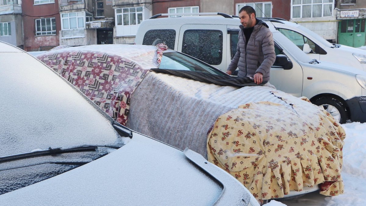 Kapalı otoparkları olmayan sürücüler araçlarını bir branda ya da battaniye ile örterek önlem aldı.