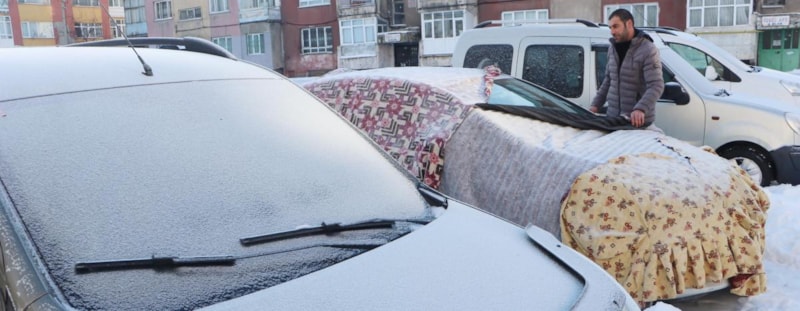 Hava buz gibi. Kapalı otopark olmadığı için dışarıda kalan araçların çoğu donuyor. Buna karşı otomobili battaniye ile sarıyorum. Sabah işe giderken yanındaki araçlar buzla kaplı iken benim otomobilde hiçbir şey yok.