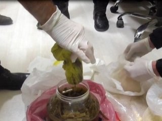 A.S.'nin üzerinde ve yanında bulunan çuval içerisinde yapılan aramada 5 litrelik turşu dolu bidon içerisinde gizlenmiş, ağzı kapalı ve bantlı kahverengi cam şişe içerisinde bin 80 gram ağırlığında gri renkli cıva ele geçirildi.