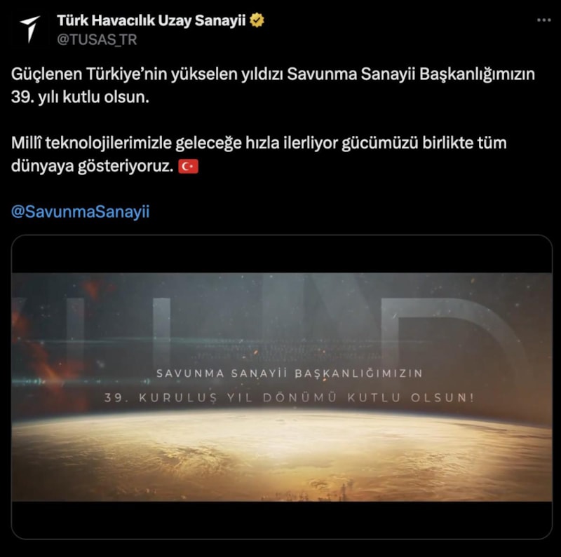 Paylaşımda, "Güçlenen Türkiye'nin yükselen yıldızı Savunma Sanayii Başkanlığımızın 39'uncu yılı kutlu olsun. Milli teknolojilerimizle geleceğe hızla ilerliyor gücümüzü birlikte tüm dünyaya gösteriyoruz." ifadeleri kullanıldı.