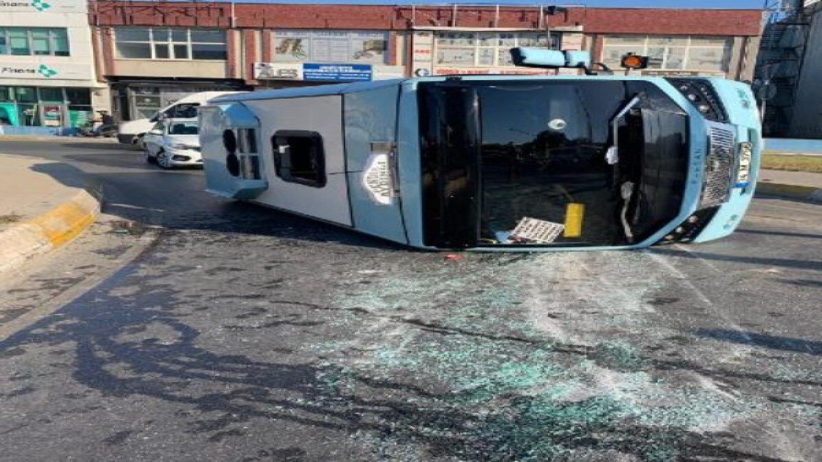 Çarpmanın etkisiyle minibüs önce kaldırıma çıktı ardından yan yattı.