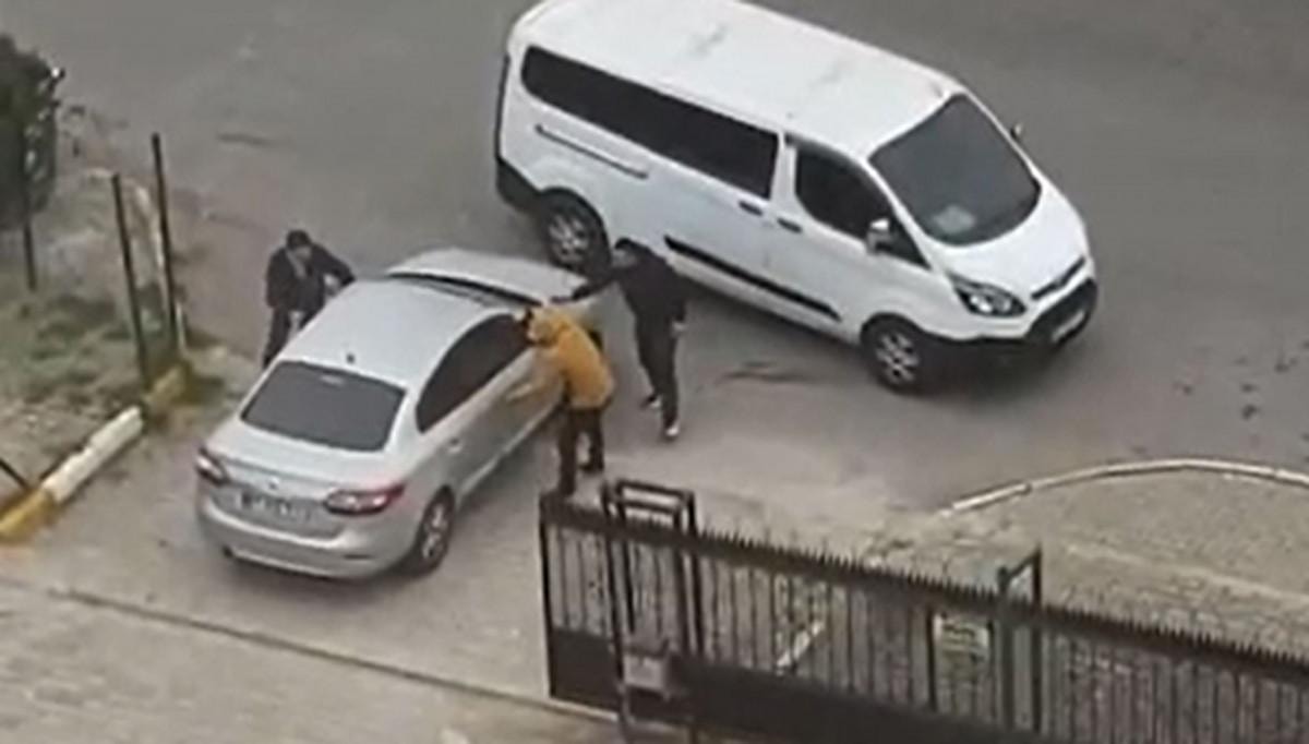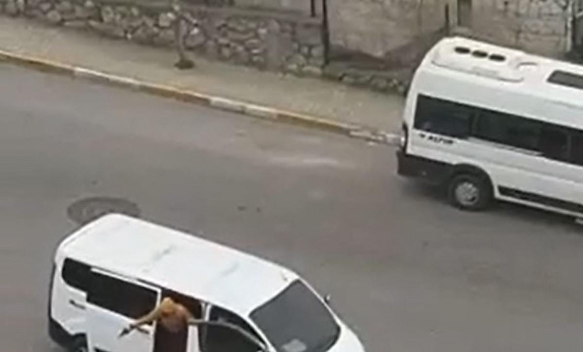 Minibüsten inen biri silahlı 3 kişi, önce aracın kapılarını açmaya çalıştı ardından camlara vurarak adeta dehşet saçtı.