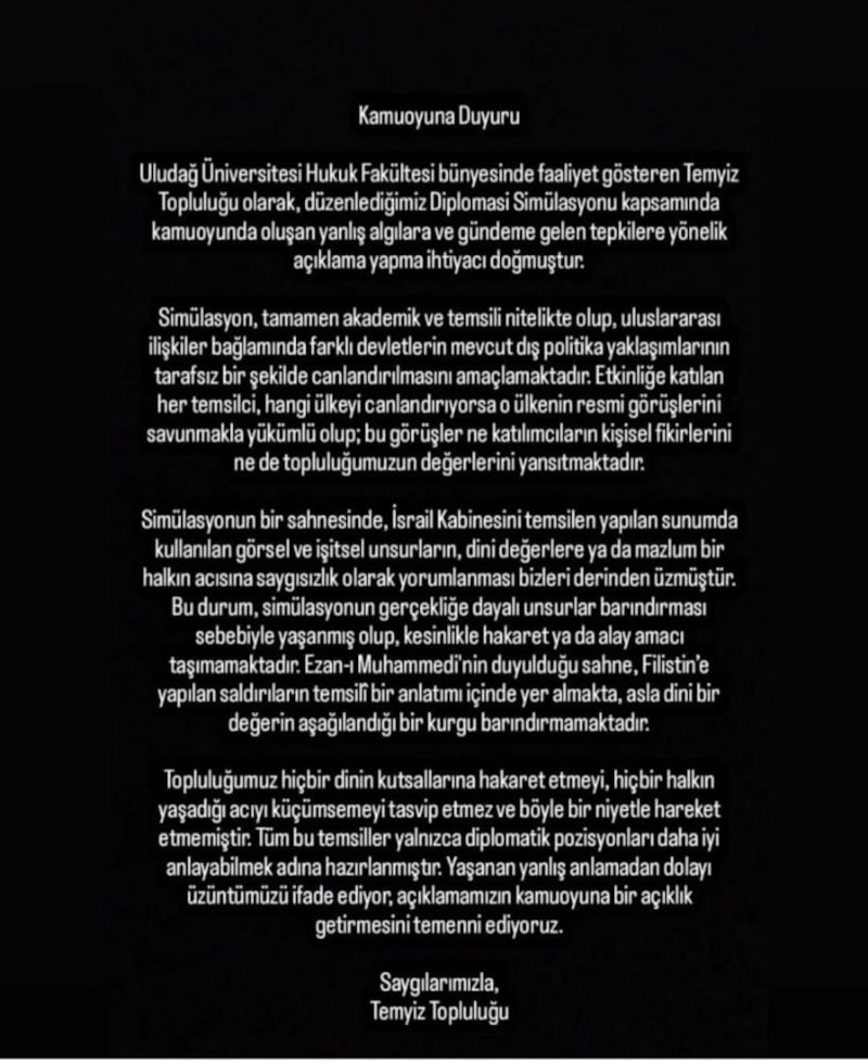 Uludağ Üniversitesi Hukuk Fakültesi bünyesinde faaliyet gösteren Temyiz Topluluğu olarak, düzenlediğimiz Diplomasi Simülasyonu kapsamında kamuoyunda oluşan yanlış algılara ve gündeme gelen tepkilere yönelik açıklama yapma ihtiyacı doğmuştur. Simülasyon, tamamen akademik ve temsili nitelikte olup, uluslararası ilişkiler çerçevesinde farklı devletlerin mevcut dış politika yaklaşımlarının tarafsız bir şekilde canlandırılmasını amaçlamaktadır. Etkinliğe katılan her temsilci, hangi ülkeyi canlandırıyorsa o ülkenin resmi görüşlerini savunmakla yükümlü olup; bu görüşler ne katılımcıların kişisel fikirlerini ne de topluluğumuzun değerlerini yansıtmaktadır. Simülasyonun bir sahnesinde, İsrail Kabinesini temsilen yapılan sunumda kullanılan görsel ve işitmeyle ilgili unsurların, dini değerlere ya da mazlum bir halkın acısına saygısızlık olarak yorumlanması bizleri derinden üzmüştür. Bu durum, simülasyonun gerçekliğe dayalı unsurlar barındırması sebebiyle yaşanmış olup, kesinlikle hakaret ya da alay amacı taşımamaktadır. Ezan-i Muhammedi'nin duyulduğu sahne, Filistin'e yapılan saldırıların temsili bir anlatımı içinde yer almakta, asla dini bir değerin aşağılandığı bir kurgu barındırmamaktadır. Topluluğumuz hiçbir dinin kutsallarına hakaret etmeyi, hiçbir halkın yaşadığı acıyı küçümsemeyi tasvip etmez ve böyle bir niyetle hareket etmemiştir. Tüm bu temsiller yalnızca diplomatik pozisyonları daha iyi anlayabilmek adına hazırlanmıştır. Yaşanan yanlış anlamadan dolayı üzüntümüzü ifade ediyor, açıklamamızın kamuoyuna bir açıklık getirmesini temenni ediyoruz.