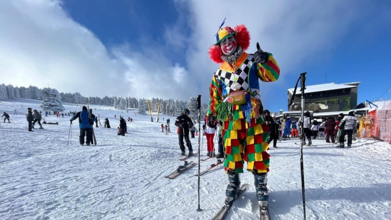 Profesyonel olarak animatörlük yapan Mücahit Değirmenci, Uludağ’da zirveye palyaço kıyafeti, makyajı ve peruğuyla çıkıp, pistlerde kayarak tatilcileri eğlendirdi.