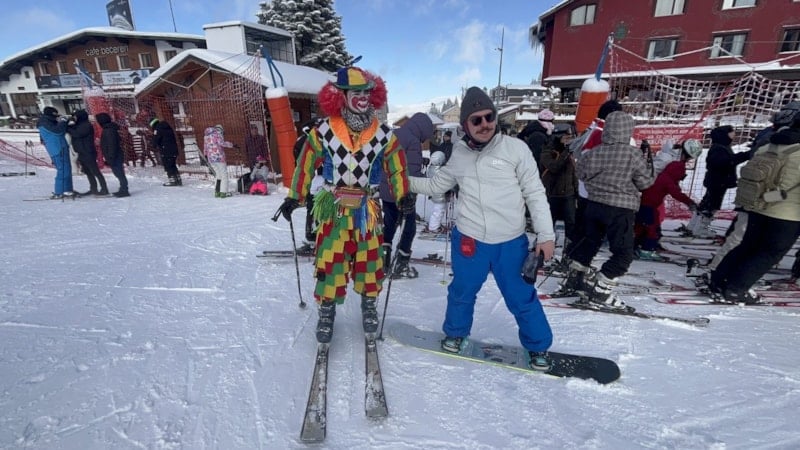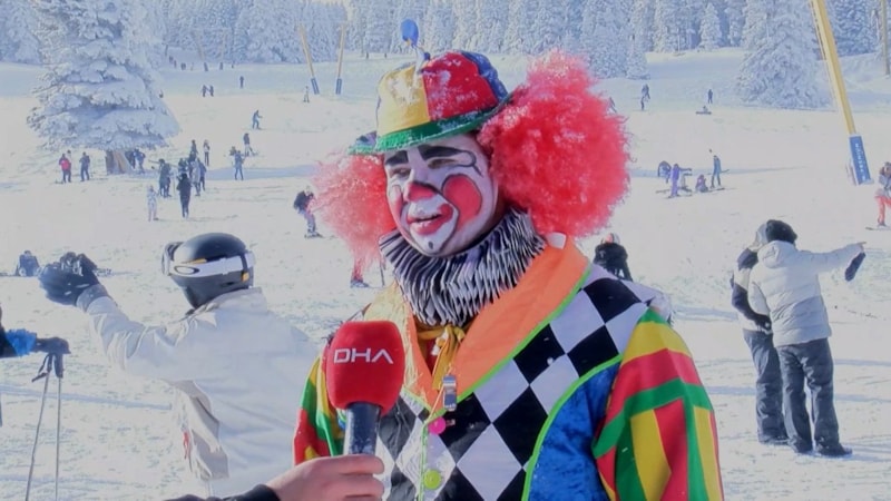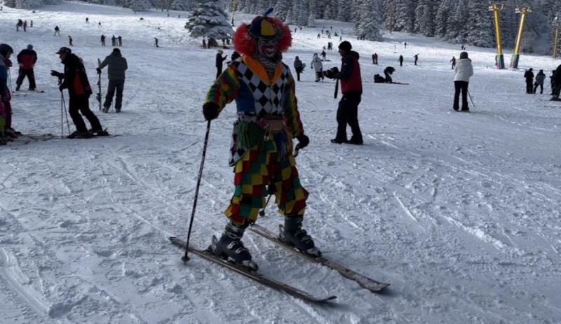 Bursa’da profesyonel animatörlük yapan Mücahit Değirmenci, farkındalık yaratmak ve tatilcilere moral vermek amacıyla palyaço kostümünü giyip, kayak takımlarını kuşandı.