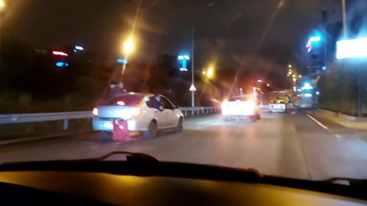 Konvoy halinde ilerleyen grup, araç camlarından sarktıktan sonra makas atarak trafikte dehşet saçtı.