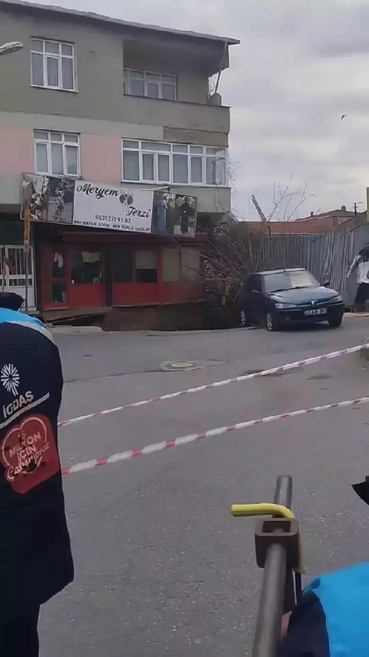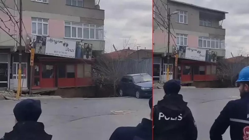 Bir otomobil oluşan çukurun kenarında askıda kalırken, olay yerine ekipler sevk edildi.