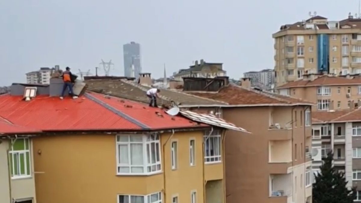 Ümraniye'de rüzgardan uçan çatıyı tutmaya çalıştılar VİDEO