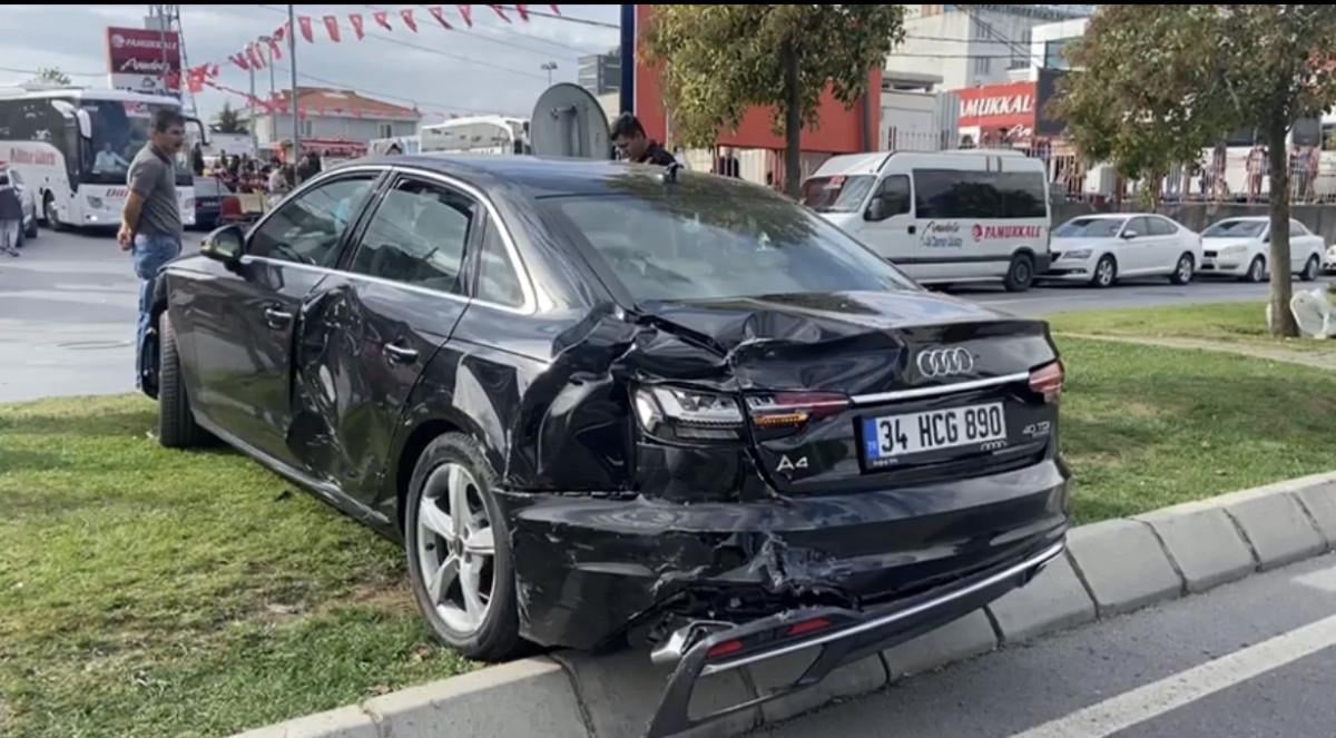 Otobüs, cadde üzerinde seyir halindeki Fahrettin Karataş idaresindeki otomobile çarparak orta refüje çıkartı.