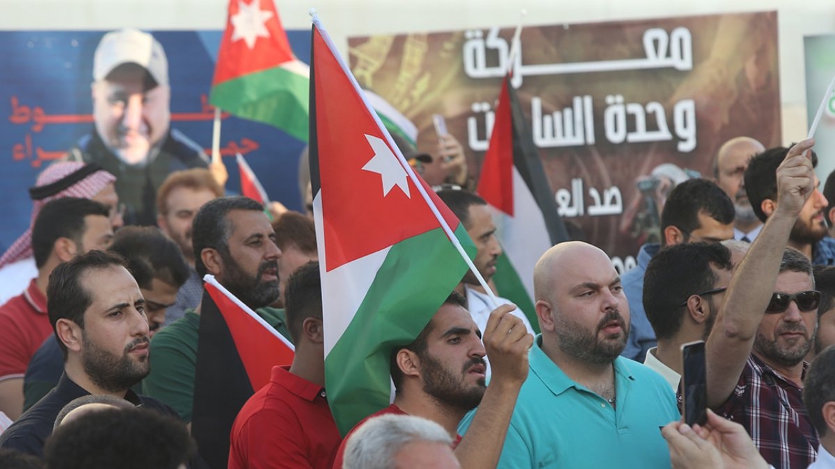 Yürüyüşe katılan yüzlerce Ürdünlü, Filistinlilerin tehciri ve ABD karşıtı sloganlar attı.