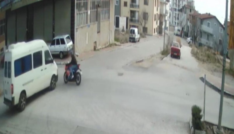 Minibüs sürücüsü S.K., polis ekipleri tarafından gözaltına alınırken, kazaya ilişkin anlar çevredeki bir iş yerinin güvenlik kamerasına yansıdı. Görüntülerde, motosikletin minibüsle çarpışma anı ve minibüs sürücüsünün aracından inerek yaralıya yardım etmeye koştuğu görüldü.