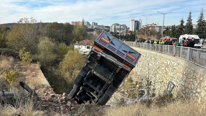 Arıza yapan tırın sürücüsü tırın kabinini kaldırıp tamir etmeye çalıştığı sırada hareket eden araç, karşı şeride geçerek dereye uçtu.