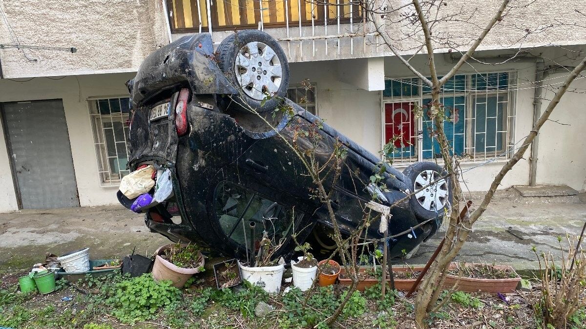 Kontrolden çıkan araç, demir bariyerleri kırıp 10 metre yükseklikten apartman bahçesine düştü.