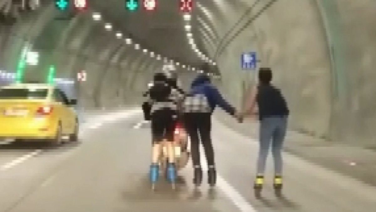 İstanbul Üsküdar Çamlıca Tüneli’nde seyir halinde olan motosikletin arkasına tutunarak hızla ilerleyen 3 patenci gencin o anları yürekleri ağızlara getirdi.
