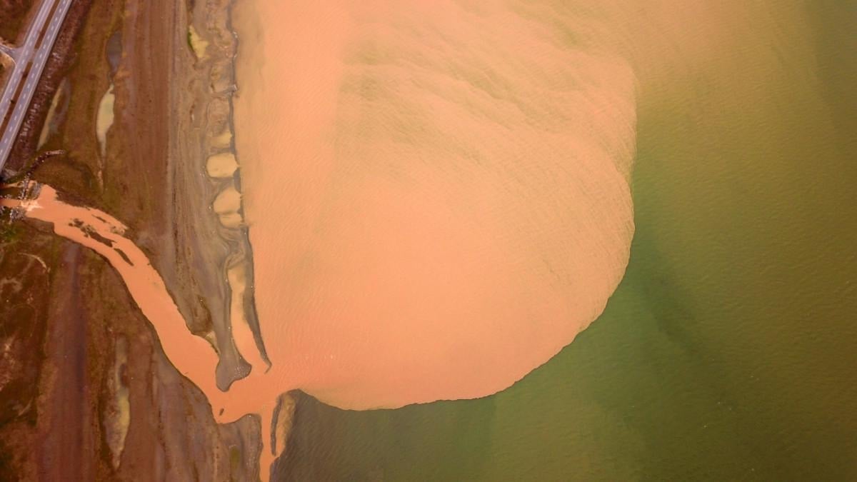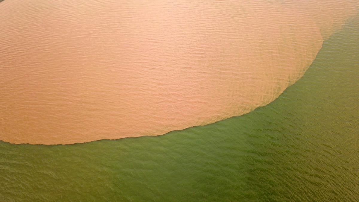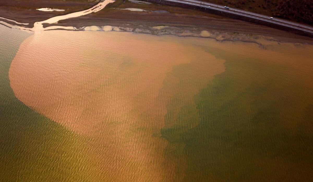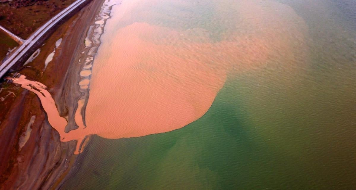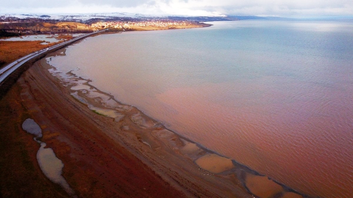 Göl kıyısında kahverengiye dönen yaklaşık 10 kilometrelik alan, havadan görüntülendi.