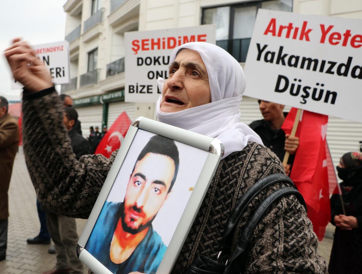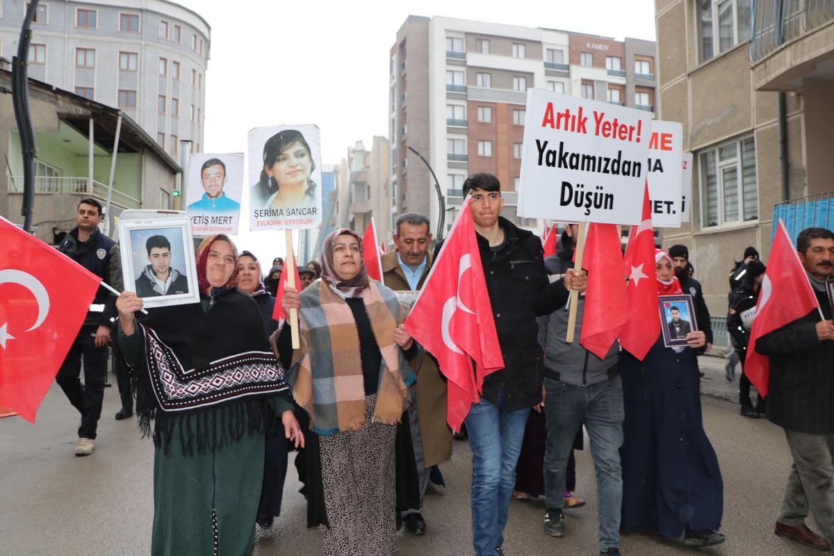 Cumhuriyet Caddesi'nde bir araya gelen aileler, ellerinde Türk bayrakları, çocuklarının fotoğrafları ve üzerinde 'Dağları kurtlara, kuşlara bırakın', 'Çocuklarımızı istiyoruz', 'Anneler nöbette', 'Artık yeter, yakamızdan düşün', 'Şehitler ölmez vatan bölünmez', 'Çocuklarımız kimsenin piyonu olmayacak' yazılı dövizlerle yürüdü.