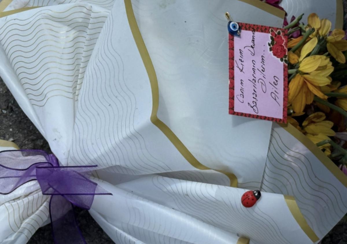 Otomobilde, üzerinde "Canım kızım başarılarının devamını dilerim. Ailen" yazılı kartın olduğu çiçek, görenleri duygulandırdı.